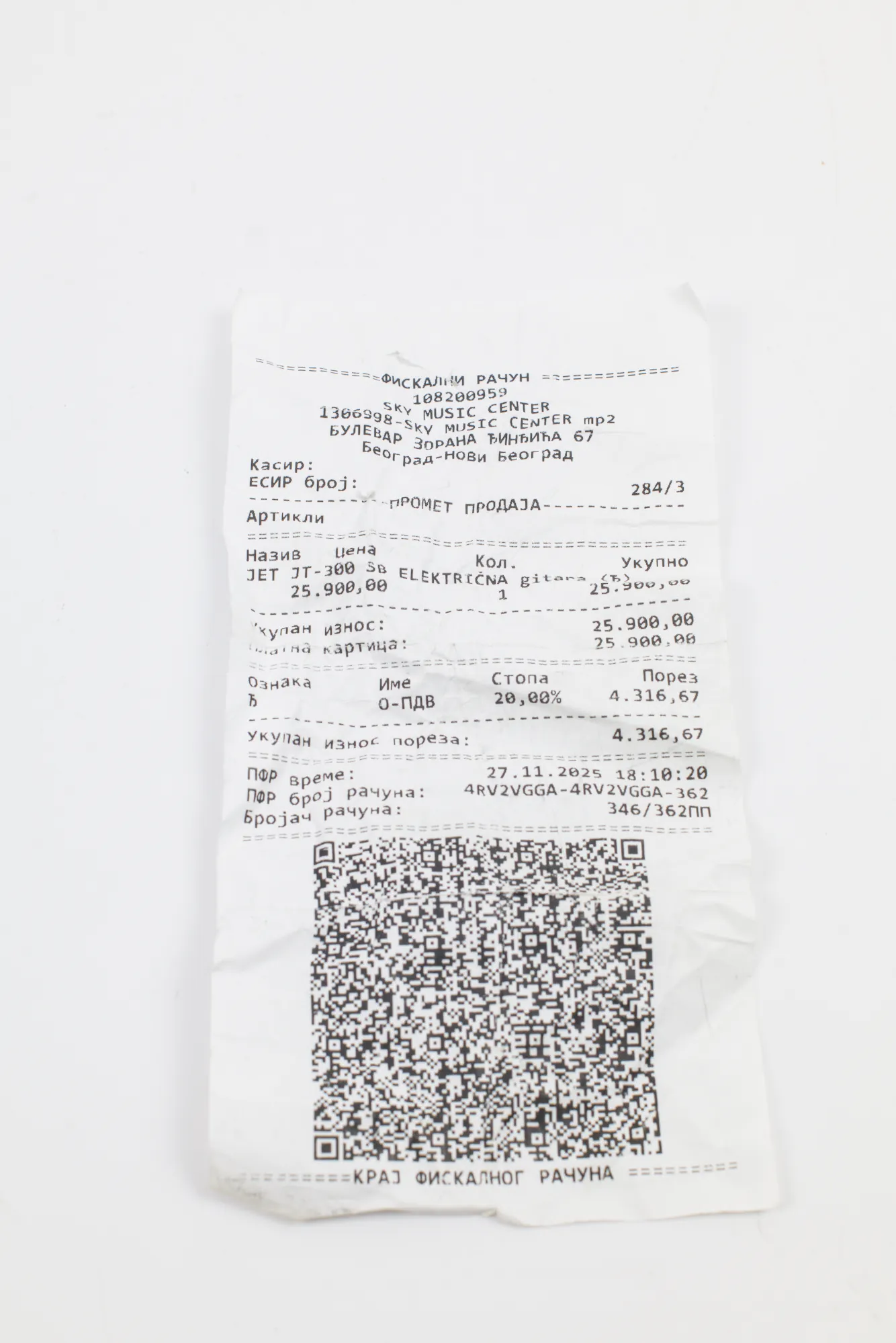 Kupljena u Sky Music 27.11.2025, dobija se fiskalni račun sa garancijom uvoznika do 27.11.2027. godine.
